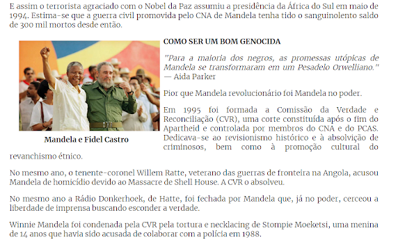 O inimigo do meu inimigo não é necessariamente meu amigo. Os infames bolcheviques de Lenin lutaram contra a cruel tirania czarista dos Romanov. Seus métodos eram horrendos, vitimando inclusive as crianças inocentes da família real. Ao assumir o poder Lenin e seus sucessores perpetraram horrores inauditos contra seu povo. Analogamente, Nelson Mandela lutou contra o Partido Nacionalista da África do Sul, que impunha o grotesco sistema de políticas racistas conhecido como Apartheid. Seus métodos foram diabólicos. Uma vez no poder, ele e seus sucessores espalharam o terror pelo país. E seu objetivo? O mesmo que o de Lenin. Mandela foi um terrorista. Seu modus operandi incluía uso de minas e explosivos contra civis inocentes, assassinato de negros não alinhados à sua causa, incêndios contra negócios cujo proprietário era negro, greves e boicotes incitados através de coerção e tortura. Aterrorizava as mesmas pessoas que dizia estar libertando da tirania do Apartheid.