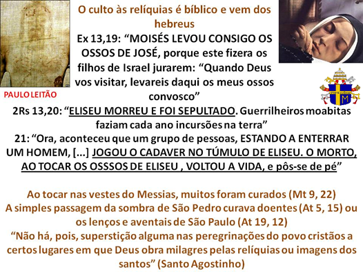 A melhor forma de responder a esse tipo de acusação está na Suma Teológica de S. Tomás de Aquino, que diz:“O próprio Deus honra como convém as suas [dos santos] relíquias, pelos milagres que faz na presença delas” (STh III 25, 5).E mesmo que não se creia nos relatos de milagres e curas que ocorreram pelo contato com corpos ou roupas de santos da Igreja, não se pode negar o que diz a própria S. Escritura: “Certa vez, alguns homens que estavam a enterrar um morto avistaram um desses bandos. Atiraram o corpo para dentro do túmulo de Eliseu e fugiram. Aconteceu que o morto, ao tocar nos ossos de Eliseu, voltou à vida e pôs-se de pé” (2Rs 13, 21).É, pois, Deus mesmo quem venera os restos mortais (isto é, as relíquias) de seus santos, como disse S. Tomás. E o que se vê no Antigo, está presente também, no Novo Testamento, como no caso de S. Paulo, que, enquanto era vivo, servia de instrumento para Deus realizar milagres e, mais pontualmente, o que relata a passagem abaixo, extraída dos Atos dos Apóstolos: “Deus realizava milagres extraordinários pelas mãos de Paulo, a tal ponto que pegavam em lenços e aventais usados por Paulo para os colocar sobre os doentes, e estes eram libertados das suas doenças e os espíritos maus eram afastados” (At 19, 11s).Eis o fundamento das chamadas relíquias de primeira, segunda e terceira classe. As de primeira classe são os restos mortais propriamente ditos, ao passo que os objetos que estiveram em contato com o santo são as de segunda classe. Há quem fale de relíquias de terceira classe. Contudo, essas poderiam ser chamadas, mais adequadamente, de “lembranças”, por tratar-se de objetos que tocaram o túmulo do santo. Seja como for, não há dúvida de que Deus pode servir-se de qualquer coisa para operar milagres. É evidente, por outro lado, que não é o corpo do santo, em si mesmo, que realiza o milagre — afirmá-lo seria um absurdo teológico e, quiçá, uma forma de “pensamento mágico” —, senão que é algo por ocasião do qual Deus pode e quer realizar prodígios. No Concílio de Trento, os padres conciliares aprovaram um decreto sobre a invocação, a veneração e as relíquias dos santos e sobre as imagens sagradas, de 3 de dezembro de 1563. Nele, lê-se o seguinte: “Devem ser venerados pelos fiéis os santos corpos dos santos mártires e dos outros que vivem com Cristo, corpos que foram membros vivos do mesmo Cristo e templo do Espírito Santo, que por ele devem ser ressuscitados para a vida eterna e glorificados e pelos quais Deus concede aos homens muitos benefícios. Por isso, os que afirmam que às relíquias dos santos não se deve veneração nem honra, ou que inutilmente os fiéis as honram como também a outros monumentos sagrados, e que em vão frequentam as memórias dos santos para obter o seu auxílio, todos devem ser absolutamente condenados como já outrora a Igreja os condenou e também agora os condena” (DH 1822).
