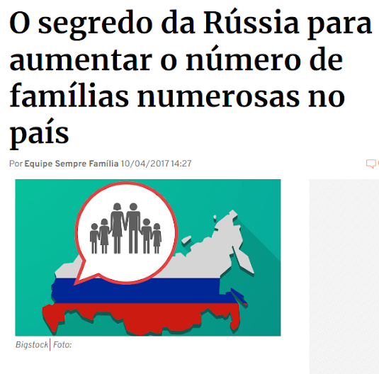 Segundo um documento elaborado por Alexei Vóvchenko, primeiro vice-ministro do Trabalho, há hoje no país mais de 1,5 milhão de famílias com pelo menos três filhos – um aumento de 25% em relação ao último censo, em 2010. A tendência é resultado de uma política de apoio estatal que, entre outras medidas, garante auxílio econômico a famílias com dois filhos ou mais. “Hoje em dia, as famílias numerosas não são apenas uma parte a mais da sociedade, mas um suporte para o Estado e para seu desenvolvimento futuro”, disse Pável Sychiov, vice-presidente da Comissão da Câmara Civil para a Proteção da Família, Infância e Maternidade. Para ele, as famílias numerosas surgem quando “existe confiança no amanhã”. Em 2012, o presidente Vladimir Putin declarou como objetivo nacional o aumento do número das famílias com três filhos. Para Yuri Krupnov, presidente do Conselho de Observação do Instituto de Demografia, Migração e Desenvolvimento Regional, a meta agora deve ser a família com quatro filhos.A medida de maior destaque implantada pelo governo para incentivar as famílias a terem mais filhos é o programa “Capital Materno”, que dá 453 mil rublos – o equivalente a cerca de 25 mil reais – à mãe por ocasião do nascimento de cada filho, a partir do segundo. Segundo Krupnov, medidas como essa não são um gasto, mas um investimento no futuro.Na Rússia, existem 1,2 milhão de famílias com três filhos, 23 mil com quatro e 95 mil com cinco a sete filhos, além de 5 mil com oito a dez filhos e 929 com onze filhos ou mais.
